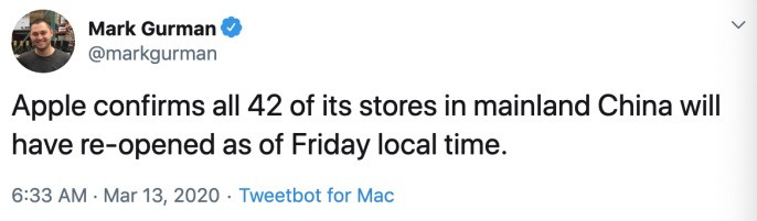 在 Twitter 上称,苹果承认我国一切门店将在周五(3 月 13 日)从头倒闭。